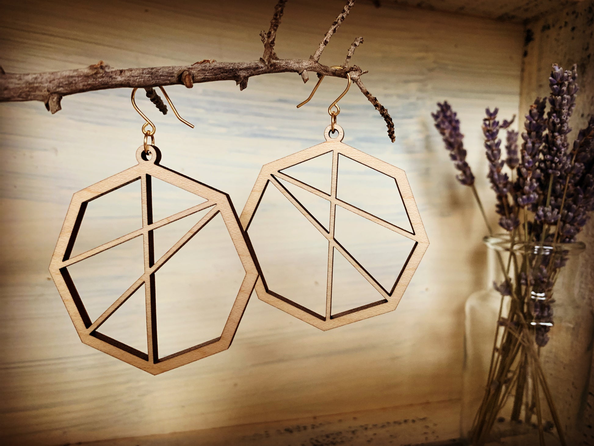 These modern octagon earrings are made of prefinished hardwood in Walnut or Maple. The earring's dimensions are 2" x 2". The hardware is gold-plated and nickel free. Earrings are a natural material and may have variations, including texture, color, and grain. Our goal at Barn and Pine is to provide you with high-quality jewelry that you can wear for any occasion. Whether you're dressing up for a special event or just accenting your everyday style, our earrings are sure to add some personality to your look.